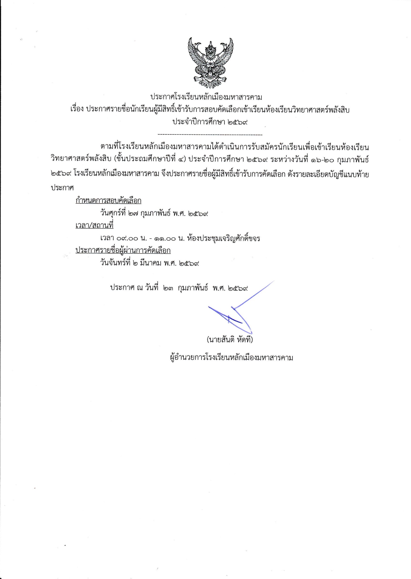 ประกาศรายชื่อนักเรียนผู้มีสิทธิ์เข้ารับการสอบคัดเลือกเข้าห้องเรียนวิทยาศาสตร์พลังสิบ ประจำปีการศึกษา2569