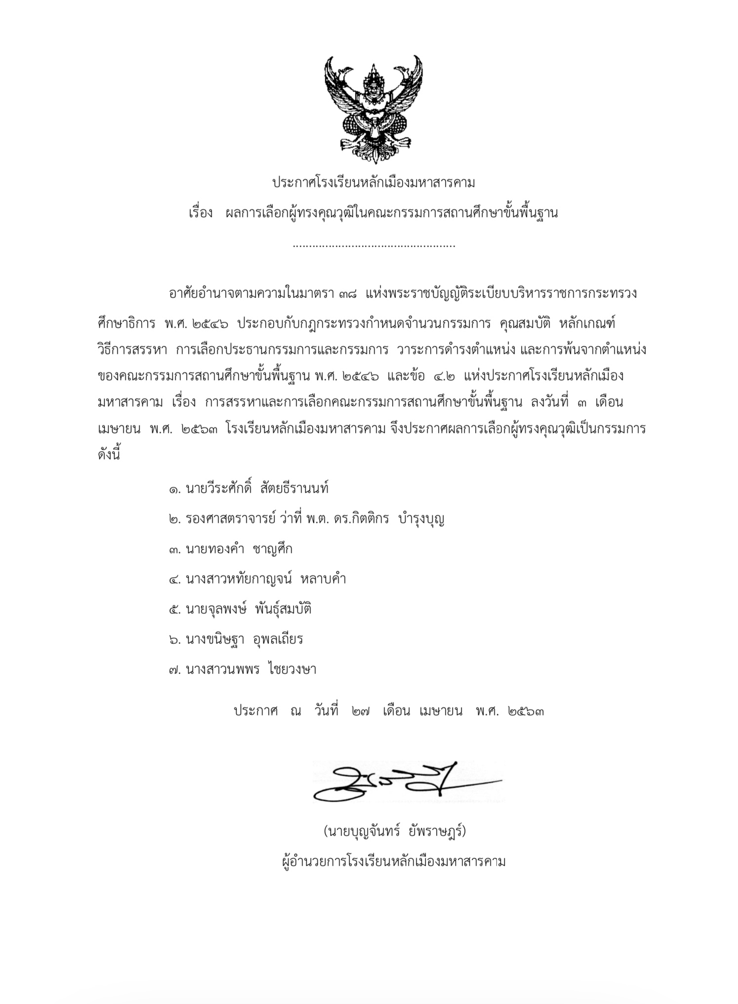 27 เม.ย.63 ประกาศโรงเรียนหลักเมืองมหาสารคาม เรื่อง ผลการเลือกผู้ทรงคุณวุฒิในคณะกรรมการสถานศึกษา