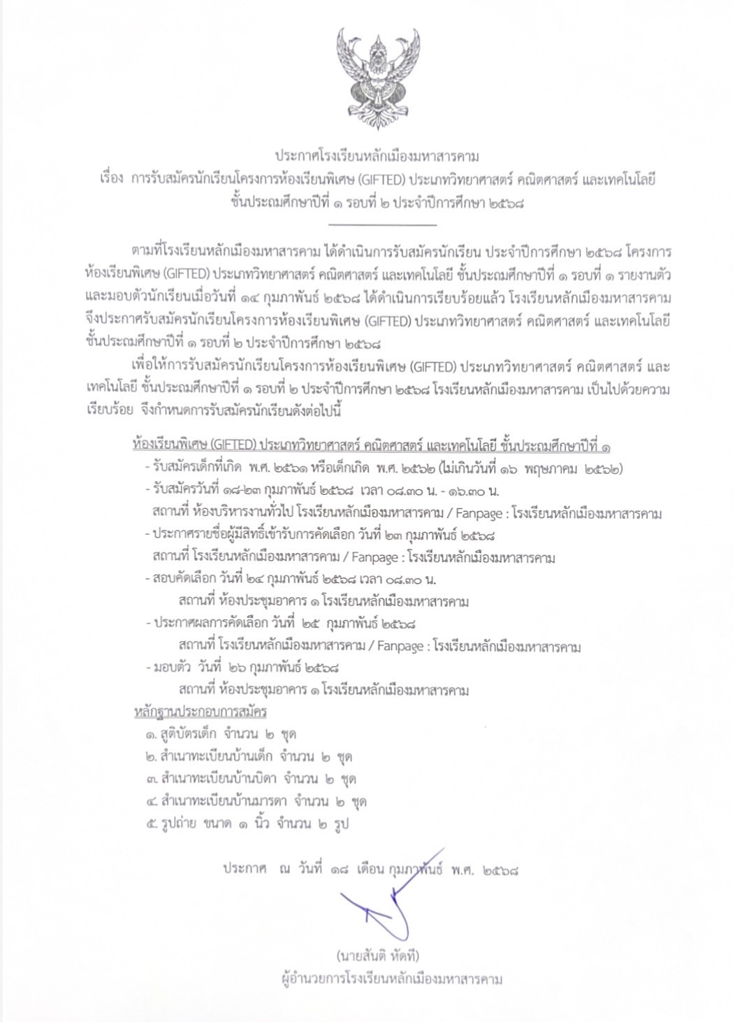 ประชาสัมพันธ์ การรับสมัครนักเรียนโครงการห้องเรียนพิเศษ (GIFTED)รอบ2