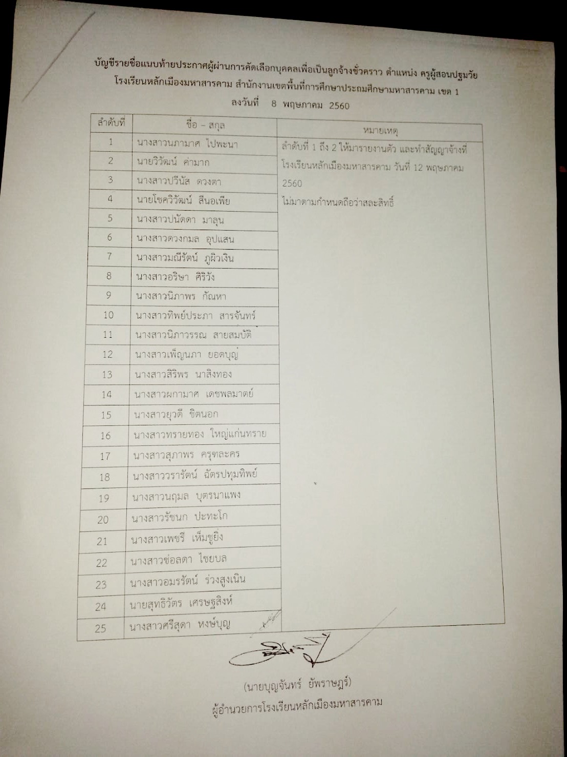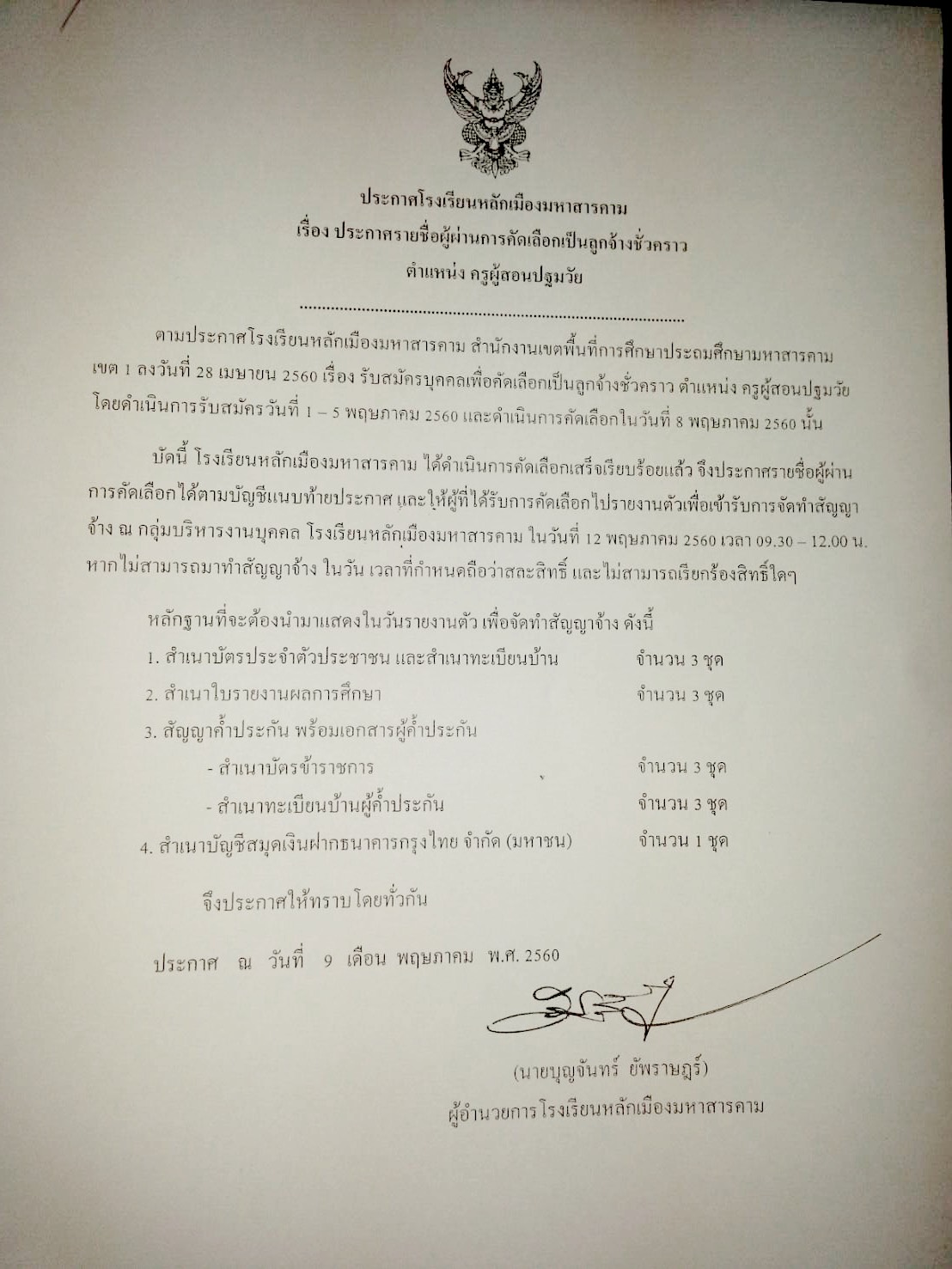 9 พ.ค.60 ประกาศโรงเรียนหลักเมืองมหาสารคาม เรื่อง ประกาศรายชื่อผู้ผ่านการคัดเลือกเป็นลูกจ้างชั่วคราว ตำแหน่ง ครูผู้สอนปฐมวัย