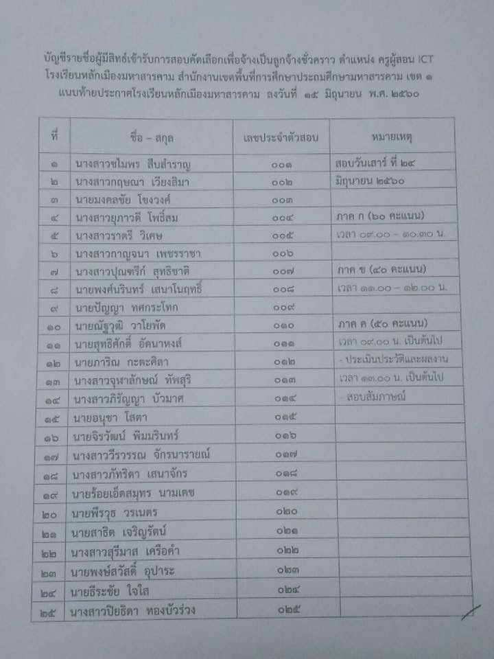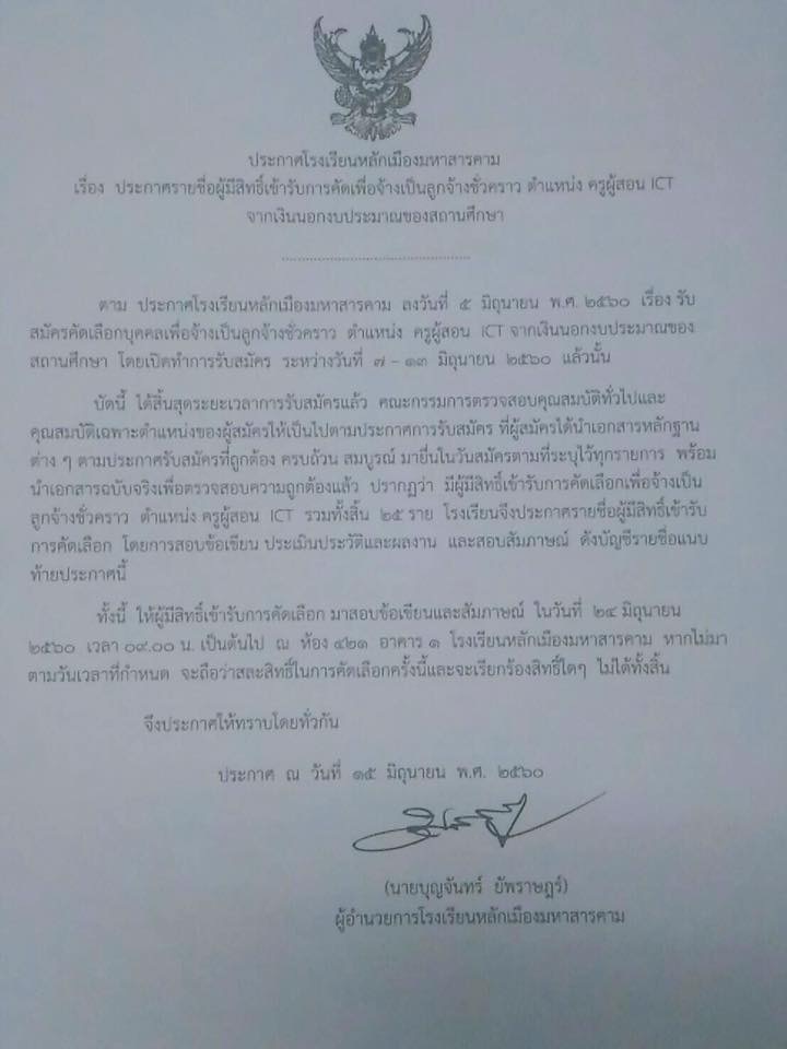 ประกาศโรงเรียนหลักเมืองมหาสารคาม เรื่อง ประกาศรายชื่อผู้มีสิทธิ์เข้ารับการคัดเลือกเพื่อเป็นลูกจ้างชั่วคราว ตำแหน่งครูผู้สอน ICT จากเงินนอกงบประมาณของสถานศึกษา |