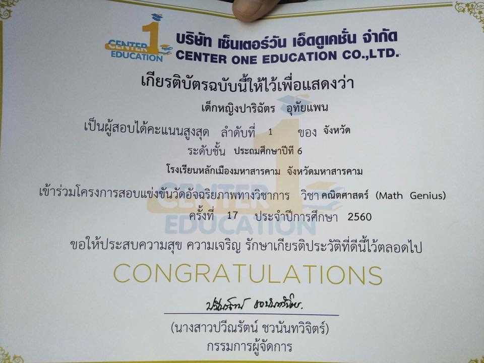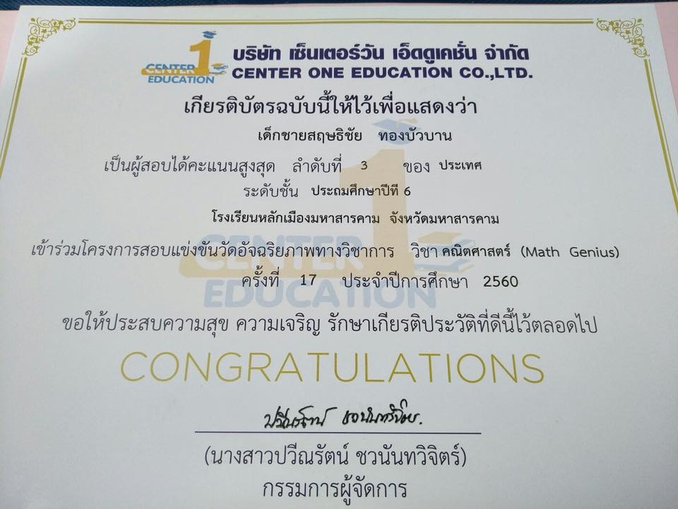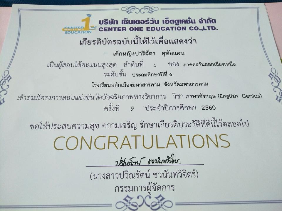 คนเก่งของเรา 1.ด.ช.สฤษธิชัย ทองบัวบาน นักเรียนชั้น ป.6 เป็นผู้สอบได้คะแนนสูงสุดลำดับที่ 3 ของประเทศ ระดับชั้น ประถมศึกษาปีที่ 6 ตามโครงการสอบแข่งขันวัดอัจฉริยภาพทางวิชาการ วิชาคณิตศาสตร์ ครั้งที่ 17 ประจำปีการศึกษา 2560 2.ด.ญ.ปาริฉัตร อุทัยแพน นักเรียนชั้น ป.6 เป็นผู้สอบได้คะแนนสูงสุด ลำดับที่ 1 ของภาคตะวันออกเฉียงเหนือ และ ลำดับที่ 1 ของจังหวัดมหาสารคาม ระดับชั้นประถมศึกษาปีที่6 ตามโครงการสอบแข่งขันวัดอัจฉริยภาพทางวิชาการ วิชาภาษาอังกฤษ ครั้งที่ 9 ประจำปีการศึกษา 2560 |