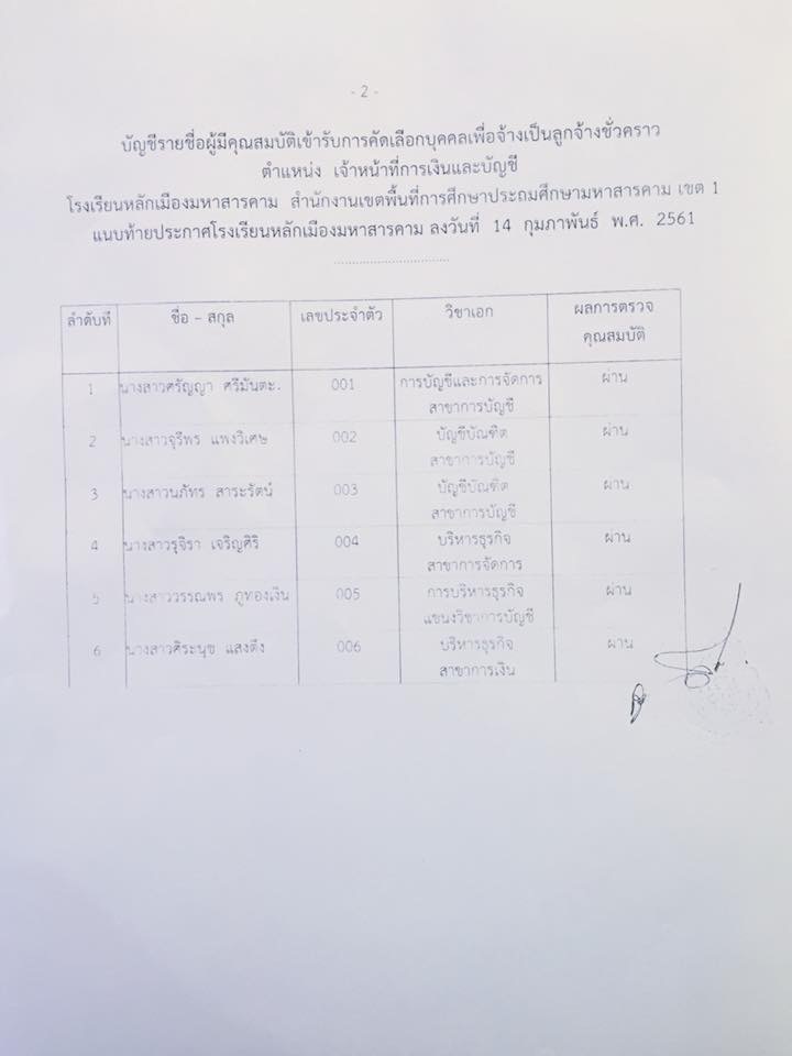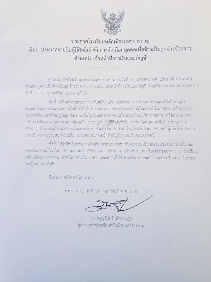 14 ก.พ.61 ประกาศโรงเรียนหลักเมืองมหาสารคาม เรื่อง ประกาศรายชื่อผู้มีสิทธิ์เข้ารับการคัดเลือกบุคคลเพื่อจ้างเป็นลูกจ้างชั่วคราว ตำแหน่ง เจ้าหน้าที่การเงินและบัญชี |