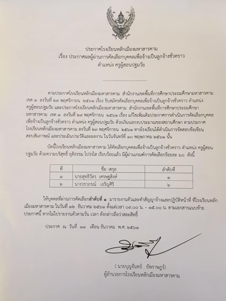 11 พ.ย.61 ประกาศผลผู้ผ่านการคัดเลือกบุคคลเพื่อจ้างเป็นลูกจ้างชั่วคราว ตำแหน่งครูผู้สอนปฐมวัย