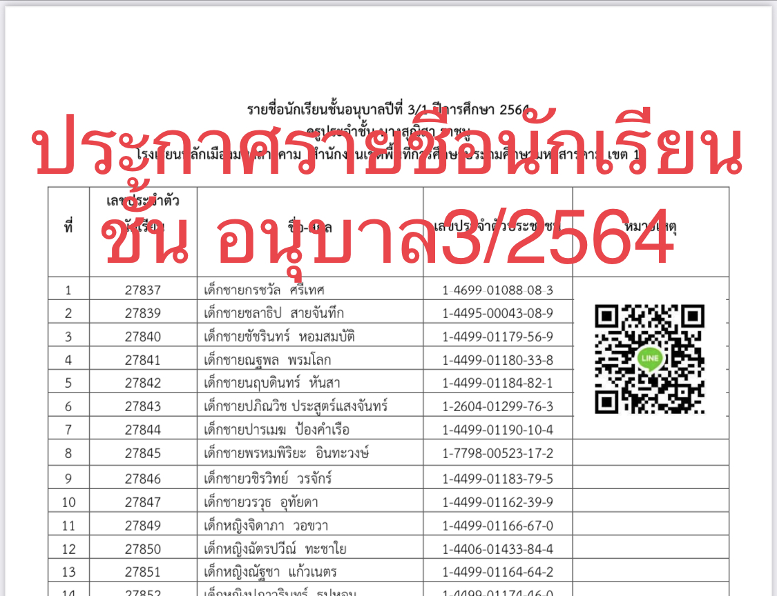 28 เมษายน 2564 ประกาศรายชื่อนักเรียนชั้น อนุบาล3/2564 สอบถามเพิ่มเติมตามเบอร์โทรในใบรายชื่อหรือ