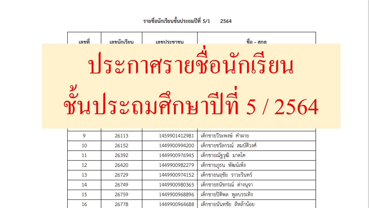 28 เมษายน 2564 ประกาศรายชื่อนักเรียนชั้น ประถมศึกษาปีที่ 5 / 2564