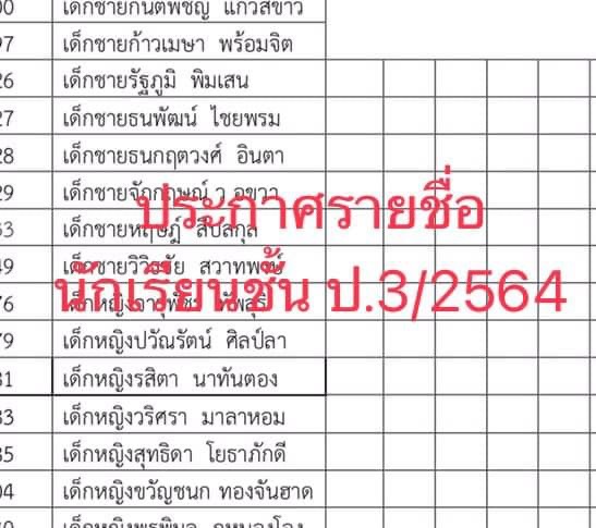 28 เมษายน 2564 ประกาศรายชื่อนักเรียน ชั้น ป.3/2564