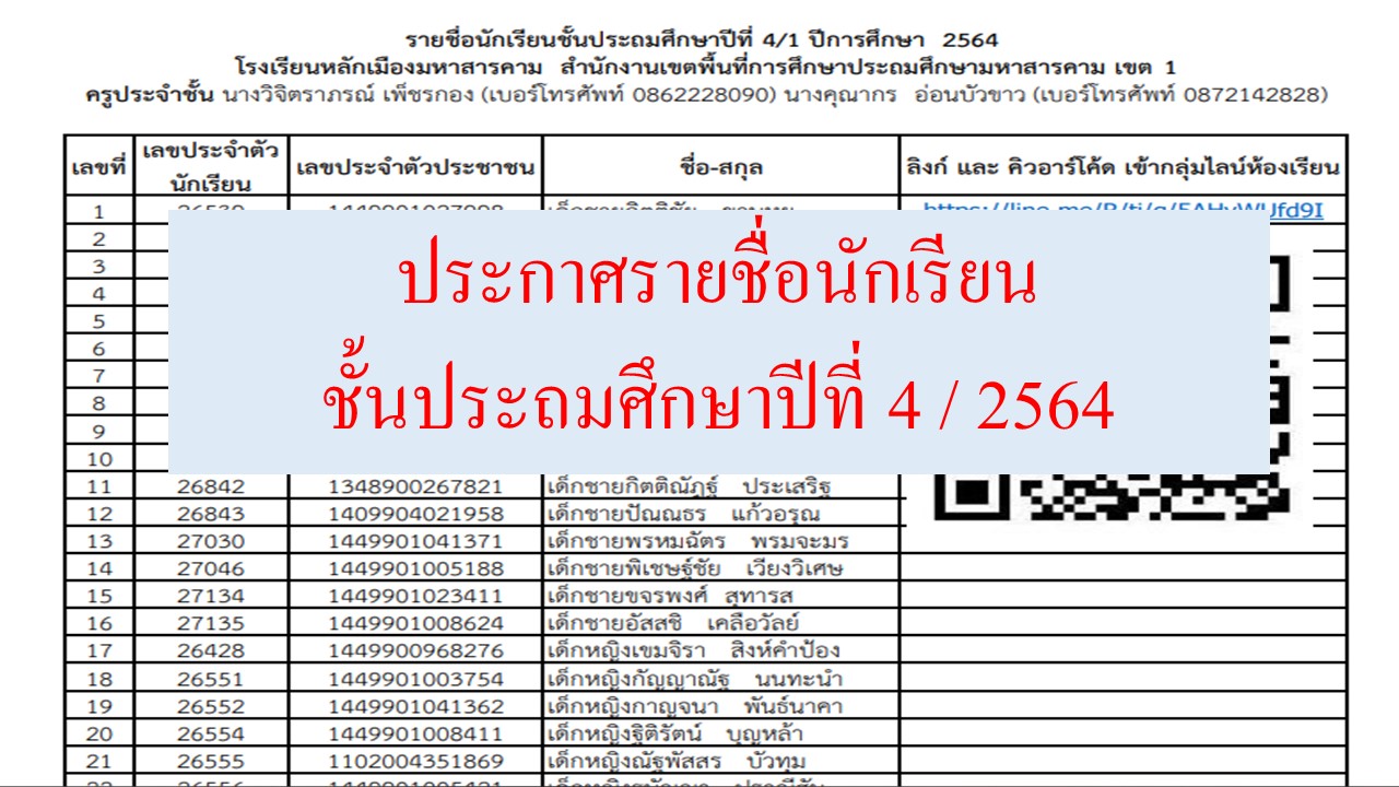 28 เมษายน 2564 ประกาศรายชื่อนักเรียน ชั้น ป.4 / 2564
